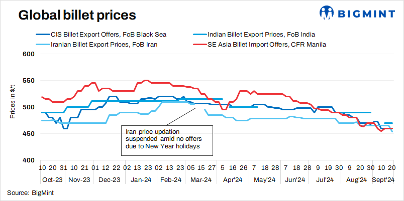 • SE Asia imported billet prices remain stable w-o-w post China holidays: Imported billet prices in Southeast Asia remained stable this week. Market participants are in wait-and-watch mode as Chinese players have returned from the Mid-Autumn Festival holidays. BigMint’s bi-weekly assessment of billets (150 x 150 mm, 3SP) imported by the Philippines remained stable w-o-w at $460/t CFR Manila on 20 September.