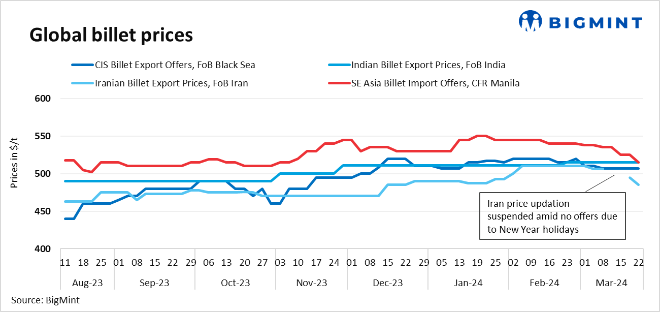 • SE Asia billet import prices drop w-o-w: Southeast Asian imported billet prices have declined on lower buying interest from market participants. Notably, billet importers have witnessed weak steel market sentiments pressurising down semi-finished demand globally. In addition, bid-offer disparities were also noted this week in the global market. According to BigMint’s bi-weekly assessment, billet import prices dipped by $10/t w-o-w to $515/t CFR Manila on 22 March 2024.