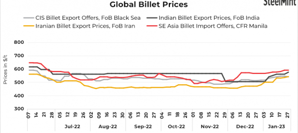 • Indian billet export tenders receive good response: A few Indian mills became active in the export market. An Indian mill had floated a tender for 30,000 t of blooms (150mm, 3SP/4SP, BoF) for end February 2023 delivery. According to sources, the tender was concluded at $570-571/t, FOB levels on 100% advance payment terms. However, confirmation could not be received till the time of publication of the report.