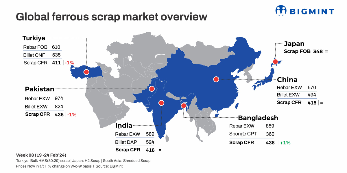 This week, global prices for ferrous scrap witnessed a decline, driven by decreased demand across various markets. In India, discrepancies in bidding and offering prices, along with cost-effective alternatives in the domestic market and ample buyer stocks, have resulted in a cautious approach from buyers. Many are opting to hold off fresh scrap bookings from overseas sources, amid significant distress sales. Additionally, markets in Pakistan and Bangladesh are facing challenges with Letter of Credit (LC) issues post-elections, alongside a sluggish finished steel sector.