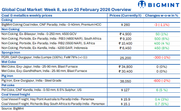 Coal market sentiment in the week ended 20 February remained firm but cautious. Imported coal prices stayed elevated due to supply disruptions in South Africa and regulatory uncertainty in Indonesia, while freight strength supported overall cost structures. However, buyers largely adopted a wait-and-watch approach as high raw material costs pressured margins. Domestic coal gained attention as a viable alternative, with selective procurement and limited fresh deals dominating market activity.