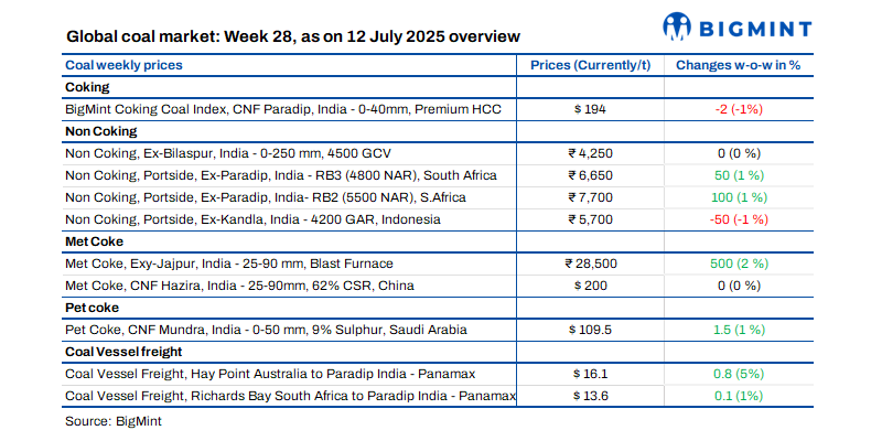 This week, India’s coal market sentiment stayed broadly cautious. Domestic coal prices held stable as demand remained subdued, with SECL’s auctions drawing only limited buying from existing players. Imported thermal coal prices saw mild upticks on higher freights and firmer sponge iron demand, yet buyers stayed hesitant due to sufficient port and power plant stocks. Coking coal offers showed disparity between Australian and Canadian cargoes, while met coke prices moved slightly higher in some hubs. Overall, market activity stayed thin, shaped by seasonal monsoon pressures, stable inventories, and cautious trading sentiment across segments.