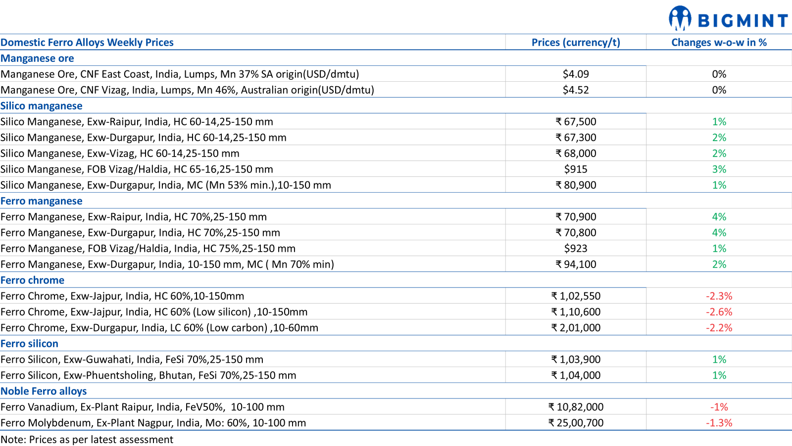 Meanwhile, HC 75% ferro manganese prices also rose by $13/t w-o-w to $923/t FOB Vizag/Haldia.