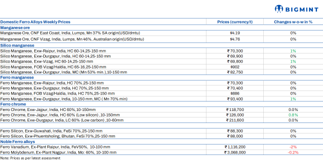 Indian ferro alloys prices showed mixed trends, with market fundamentals influenced by subdued trade momentum.