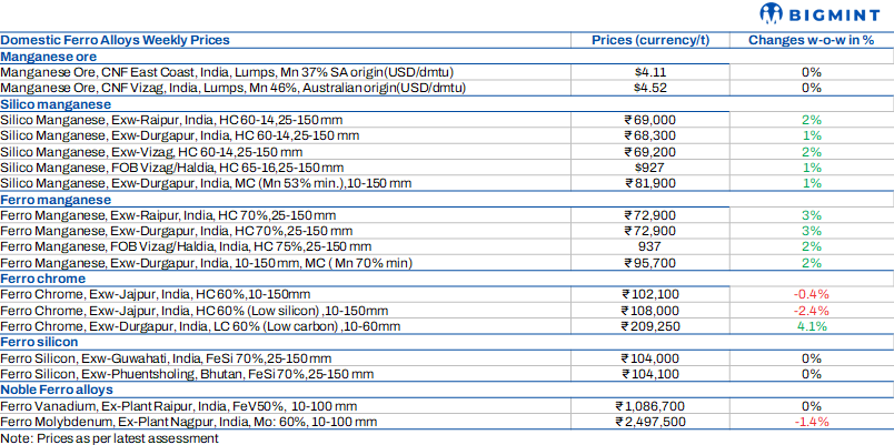 Indian ferro manganese (HC 70%) prices rose by INR 2,000/t ($23/t) to INR 72,900/t ($850/t) exw in Raipur and elevated by INR 2,100/t ($24/t) to INR 72,900/t ($850/t) exw in Durgapur. Prices scaled up w-o-w as majority of the smelters in the key producing regions did production curtailments.