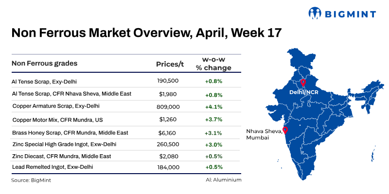 Throughout the week, both domestic and global base metals markets experienced rising trends. Imported aluminium scrap market sustained positive price levels, followed by domestic market despite the drop in LME futures. However, copper, zinc, and lead prices all witnessed a rise.
