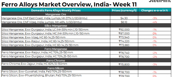 SteelMint recorded bulk deals of around 2,900 t of ferro alloys this week. Out of this, manganese deals comprised around 2,000 t, ferro chrome 400 t, and ferro silicon around 500 t.