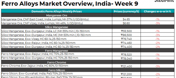 Meanwhile, domestic ferro manganese prices inched down by 2-3% w-o-w to INR 78,040/t ex-Durgapur. Meanwhile, ex-Raipur was assessed at INR 78,520/t. Prices of ferro manganese dropped due to subdued demand for special steels.