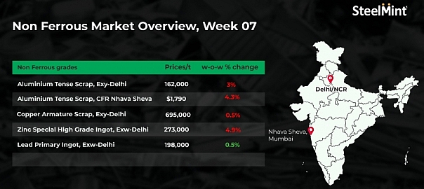 SteelMint’s assessment for US-origin aluminium talk scrap is at $4,675/t CFR Nhava Sheva, up $100/t w-o-w. Aluminium extrusion scrap offers from the Middle East stood at $2,220/t, a decrease of $90/t against w-o-w prices.