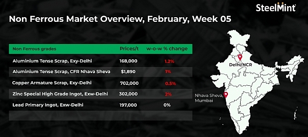 Domestic special high-grade (SHG) zinc ingots prices decreased by 2% w-o-w to INR 302,000/t ($3,661/t) exw-Delhi on lessening demand and a sharp fall in LME by 5% w-o-w. Furthermore, prices of domestic remelted lead ingots and refined lead ingots remained relatively stable.