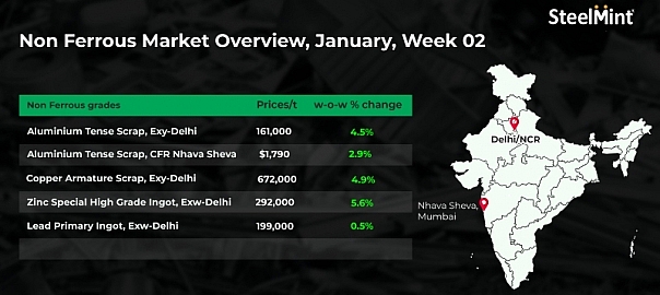 Domestic non-ferrous metals prices saw positive trends this week, rising by up to 5.8% w-o-w, as per Steelmint’s assessment.