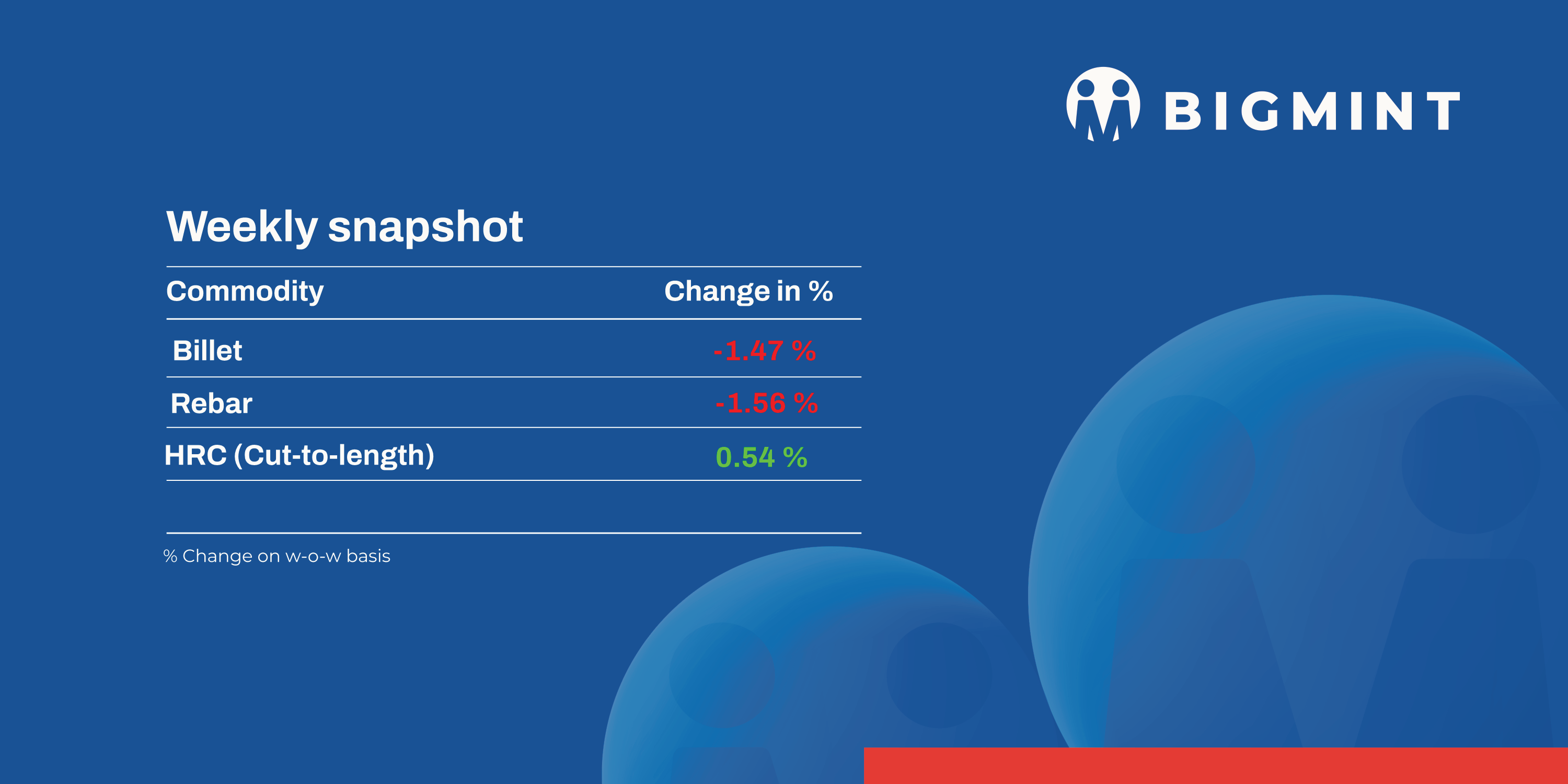 - On a weekly basis, in rebar steel prices decreased in the range of INR 300-1,000/t across the regions as per BigMint assessment shows. The trade reference price of Fe 500 grade rebar manufactured via the IF route for 10-25 mm size was assessed at INR 44,100-44,500/t exw Raipur, INR 48,500-49,000/t exw Jalna.