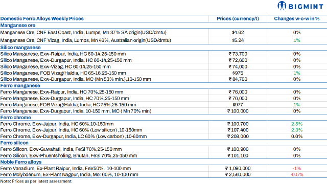 However, HC 75% ferro manganese prices went up by $5/t w-o-w to $977/t FOB Vizag/Haldia.