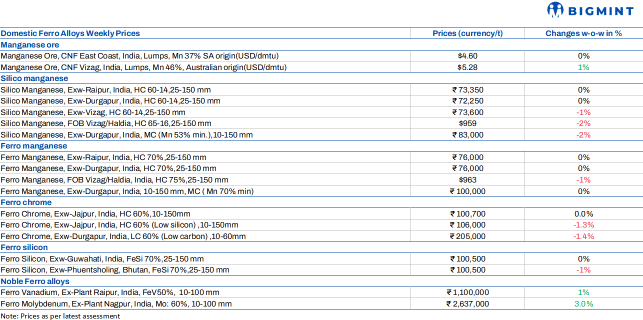 Indian ferro manganese (HC 70%) prices remained firm w-o-w and stood at INR 76,000/t ($869/t) exw in Durgapur. Meanwhie, prices exw-Raipur also remained unchaged at INR 76,000/t ($869/t). The price stability resulted from consistent market operations and subdued export demand, maintaining balance in the market without significant fluctuations or disruptions.