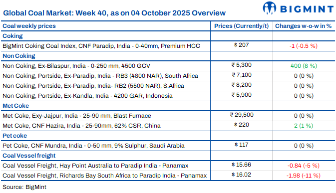 South African portside coal prices in India stayed stable this week, with RB2 at INR 8,200/t and RB3 at INR 7,100/t across Vizag and Gangavaram. Market activity remained muted due to the Dussehra holidays, with limited trade seen at INR 8,300/t ex-Vizag and Krishnapatnam. Freights from South Africa to India eased to $16.02/t, reflecting lower chartering activity. Portside inventories dipped slightly to 11.86 mnt, as traders adopted a wait-and-watch approach following GST reforms. Prices are likely to remain steady until post-festive restocking begins.