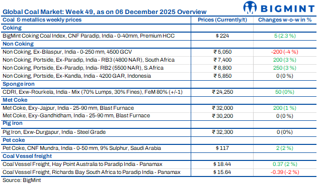 India’s PHCC index inched up to $224/t CNF Paradip on 6 Dec’25, rising $5 w-o-w amid firmer global cues. However, the domestic steel sector showed weak sentiment, and wide bid-offer gaps persisted as buyers resisted Australian offers above $220/t CFR. Prices were supported by recent Chinese deals that lifted global offers. Met coke prices had firmed in the east while staying stable in the west, even as China’s coke market softened further due to weak steel demand and rising inventories. Indian BF rebar prices showed mixed signals for early December after selective hikes by primary mills.