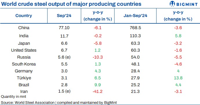 The World Steel Association (WSA) has revealed that crude steel production of the 71 countries that report to it declined by 4.7% y-o-y to 143.6 mnt in Sep’24. Additionally, production volumes edged down by 1% m-o-m against 144.8 mnt in Aug’24.