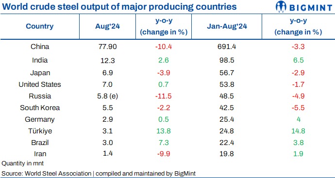 The World Steel Association (WSA) has revealed that crude steel production of the 71 countries that report to it dropped 6.5% y-o-y to 144.8 mnt in Aug’24. Additionally, production volumes fell 5% m-o-m against 152.8 mnt in Jul’24.