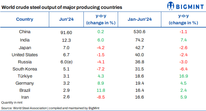 The World Steel Association (WSA) reported that crude steel production for the 71 countries has edged up by 0.5% y-o-y to 161.4 mnt in Jun’24. However, production volumes dipped by 2% m-o-m against 165.1 mnt in May’24.