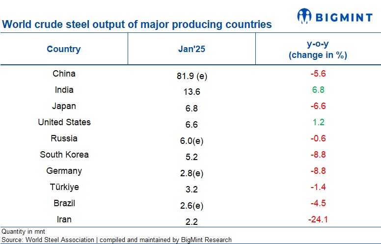 As per World Steel Association (WSA), crude steel production of the 69 countries that report to it edged down by 4.4% y-o-y to 151.4 mnt in Jan’25.
