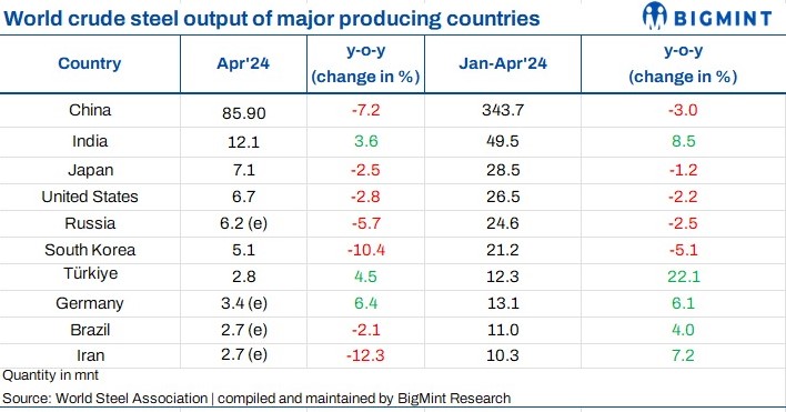 The World Steel Association (WSA) reported that crude steel production for the 71 countries has declined by 5% y-o-y to 155.7 mnt in Apr’24. Moreover, production volumes fell by 3% m-o-m against 161.2 mnt in Mar’24.
