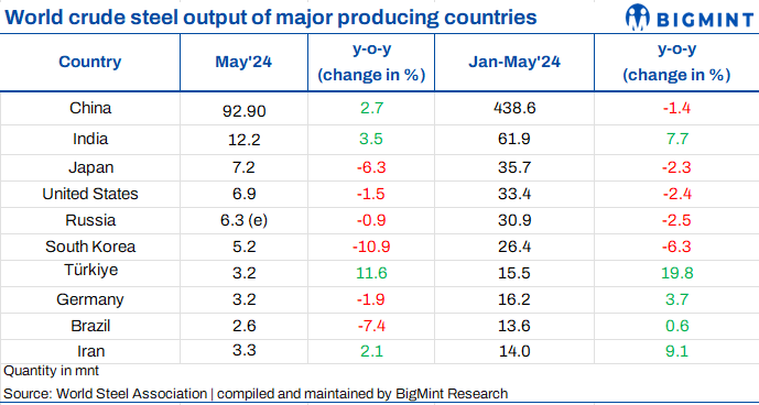 The World Steel Association (WSA) reported that crude steel production for the 71 countries has increased by 1.5% y-o-y to 165.1 mnt in May’24. Moreover, production volumes rose by 6% m-o-m against 155.7 mnt in Apr’24.